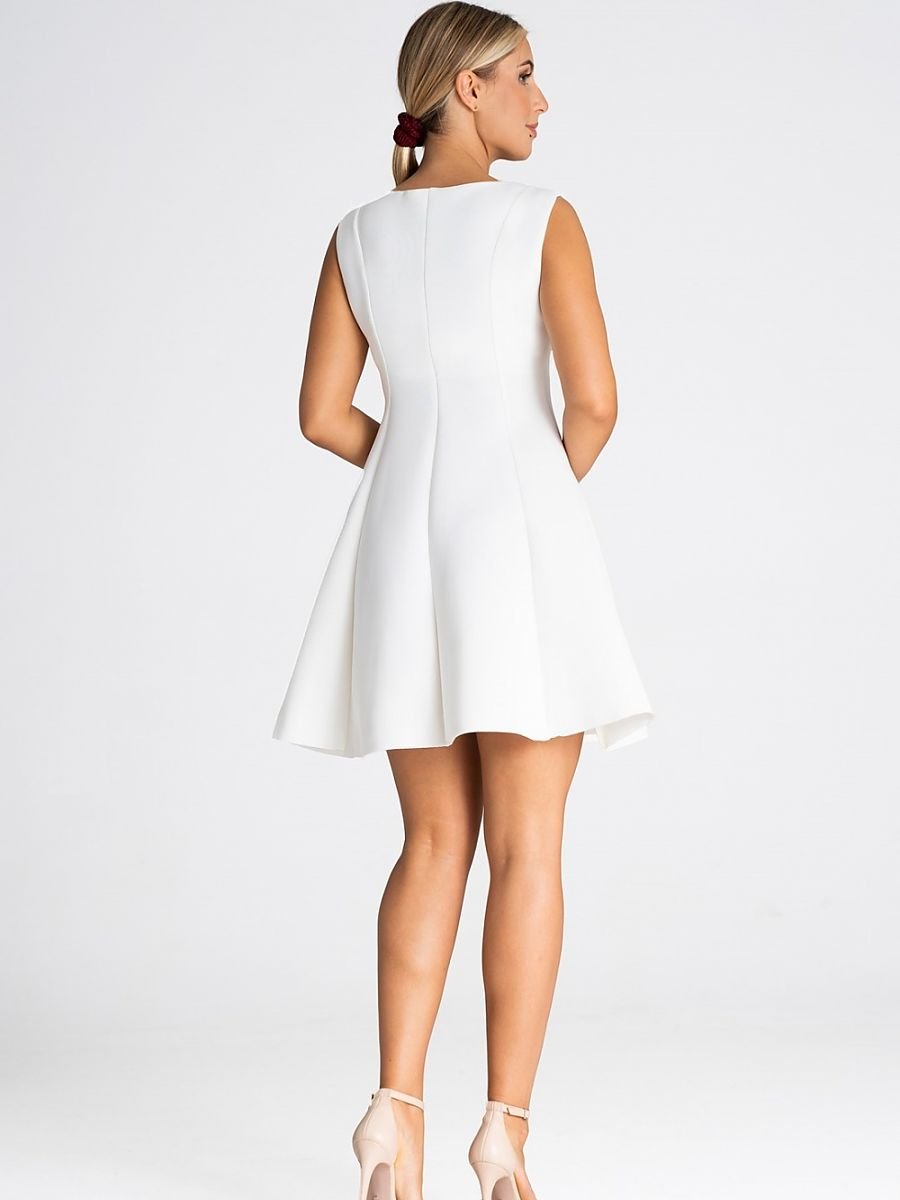 Abito senza maniche con scollatura rotonda con tagli modellanti e fondo con taglio a cerchio ampio. Il modello nasconde perfettamente i punti deboli della zona fianchi e cosce. Lunga zip decorativa sul davanti.