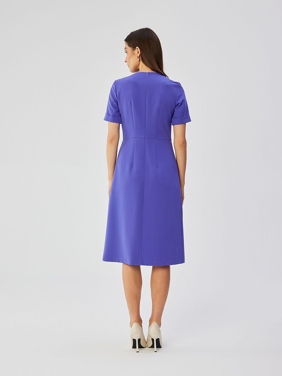 Creato con attenzione ai dettagli, l’abito è un pezzo unico, disegnato e cucito in Polonia, che evidenzia l’alta qualità della lavorazione e il carattere locale. Le pieghe decorative sui lati dell’abito aggiungono un tocco unico al look complessivo, conferendogli un aspetto distintivo e originale. La scollatura a goccia aggiunge delicatezza all’abito, evidenziando il petto delicatamente esposto. Il taglio in vita conferisce eleganza allo stile, sottolineando le curve femminili. Le maniche corte arrotolate aggiungono leggerezza all’abito e gli conferiscono un tocco casual. Il fondo ad A rende l’abito comodo e aggiunge una forma morbida e sottile alla silhouette femminile. La lunghezza sotto il ginocchio rende l’abito adatto sia alle occasioni più formali che all’abbigliamento quotidiano. La cerniera nascosta sul retro consente di indossare e togliere l’abito con facilità, pur mantenendo un aspetto elegante. L’assenza di fodera fa sì che il tessuto si appoggi piacevolmente sul corpo, rimanendo leggero e comodo da indossare. Questo abito non si distingue solo per il suo design originale, ma è anche un fiero rappresentante della sartoria e del design artigianale polacco.