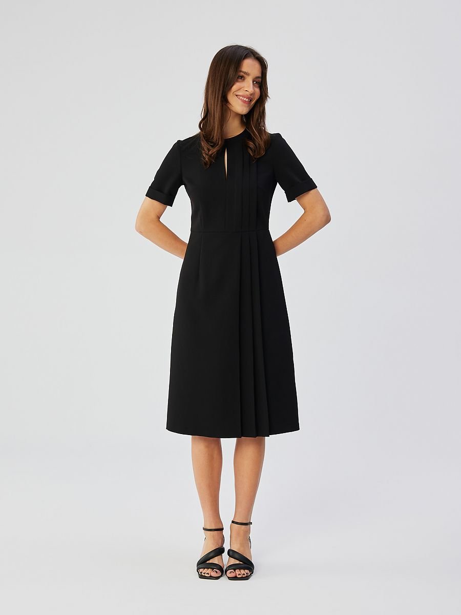 Creato con attenzione ai dettagli, l’abito è un pezzo unico, disegnato e cucito in Polonia, che evidenzia l’alta qualità della lavorazione e il carattere locale. Le pieghe decorative sui lati dell’abito aggiungono un tocco unico al look complessivo, conferendogli un aspetto distintivo e originale. La scollatura a goccia aggiunge delicatezza all’abito, evidenziando il petto delicatamente esposto. Il taglio in vita conferisce eleganza allo stile, sottolineando le curve femminili. Le maniche corte arrotolate aggiungono leggerezza all’abito e gli conferiscono un tocco casual. Il fondo ad A rende l’abito comodo e aggiunge una forma morbida e sottile alla silhouette femminile. La lunghezza sotto il ginocchio rende l’abito adatto sia alle occasioni più formali che all’abbigliamento quotidiano. La cerniera nascosta sul retro consente di indossare e togliere l’abito con facilità, pur mantenendo un aspetto elegante. L’assenza di fodera fa sì che il tessuto si appoggi piacevolmente sul corpo, rimanendo leggero e comodo da indossare. Questo abito non si distingue solo per il suo design originale, ma è anche un fiero rappresentante della sartoria e del design artigianale polacco.