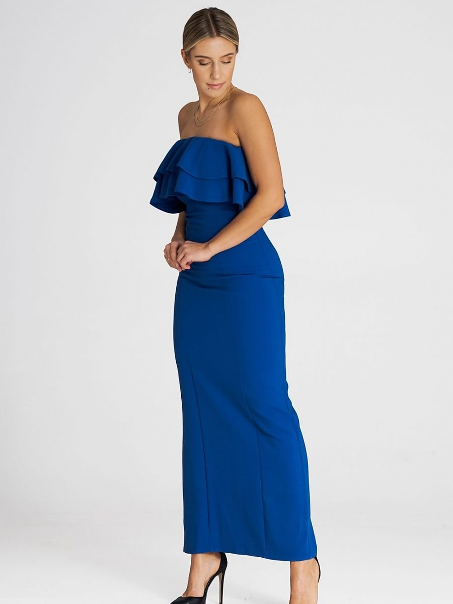 Elegante maxi abito, senza maniche e con doppio volant alla scollatura. Una proposta interessante per molte occasioni.