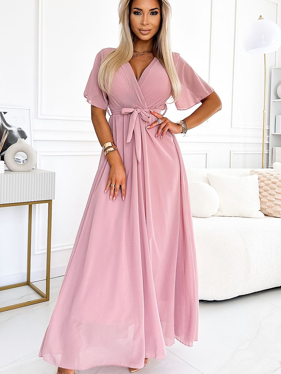 Abito lungo in chiffon con scollo plissettato, cintura e manica corta. Vestito di colore rosa sporco. Brand: numoco basic. Prodotto in Europa.
