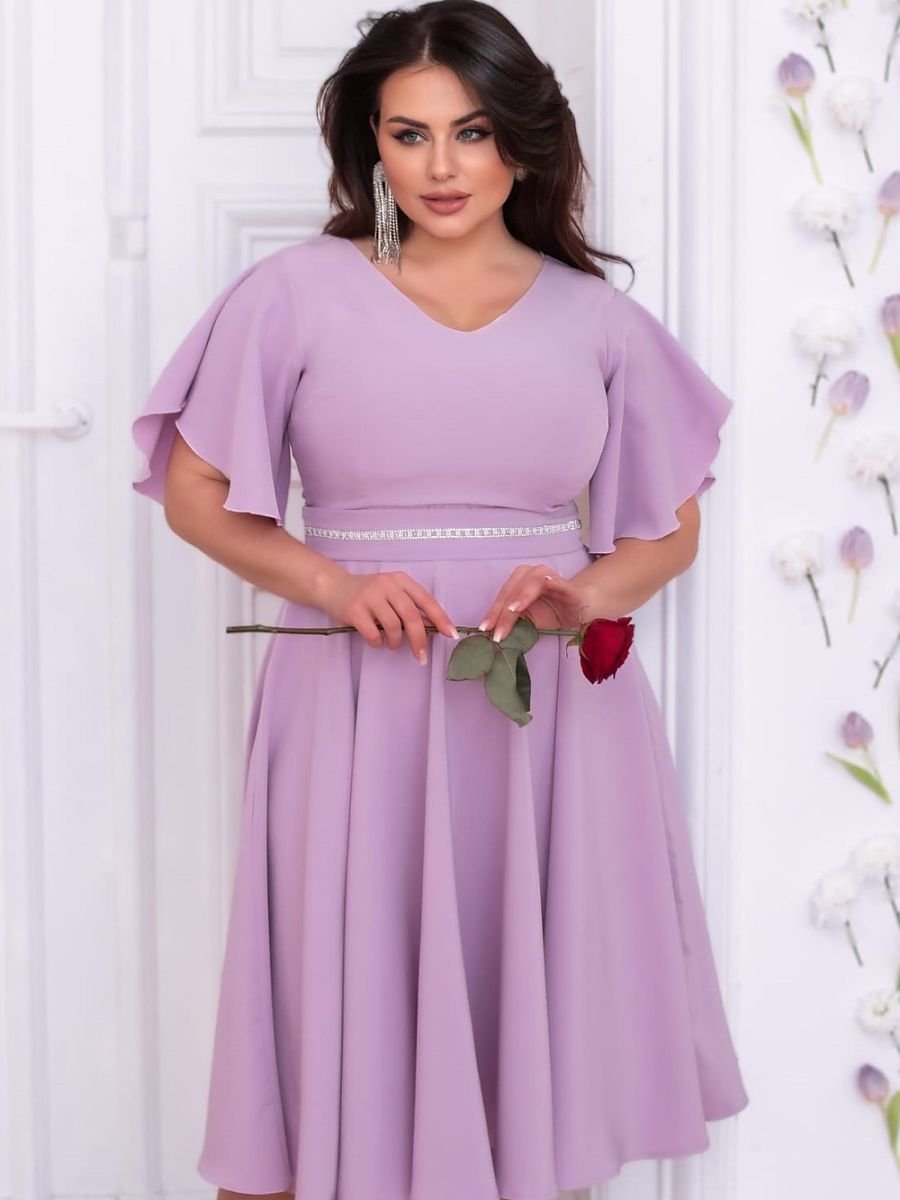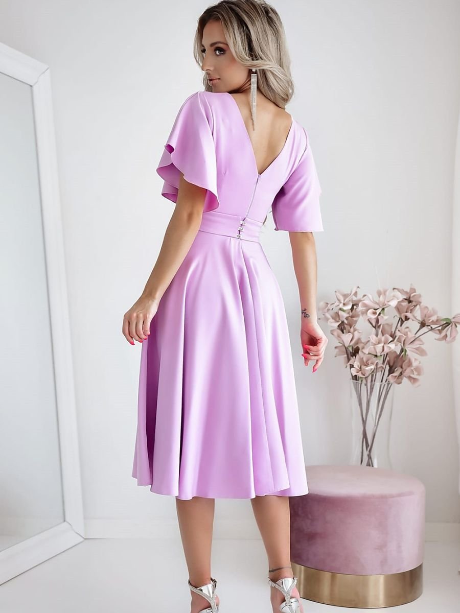 Un elegante abito in tonalità lilla è la proposta ideale per occasioni speciali. Realizzato con materiali di alta qualità, si adatta perfettamente alla silhouette, mettendo in risalto i suoi punti di forza. Il modello ha un collo a V che mette in risalto delicatamente il collo e le clavicole. Le maniche dal taglio ampio e svolazzante conferiscono leggerezza e un carattere romantico all’abito. La vita è accentuata da una cintura decorativa con delicati dettagli, che valorizza la figura. La gonna svasata dona all’abito leggerezza e classe. L’abito si chiude con una zip nascosta, garantendo comfort e una vestibilità perfetta. Perfetto per matrimoni, ricevimenti, battesimi e altri eventi eleganti.
