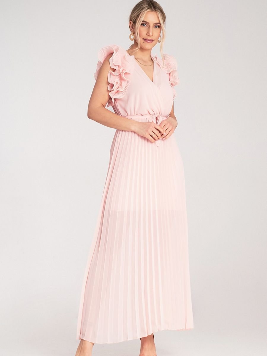 Abito lungo con scollo a busta e decorativi, doppi volant sulle spalle. In vita è inserito un elastico e una cintura in tessuto da annodare. Il fondo è lungo, con piccole pieghe, realizzato in un tessuto leggero e semitrasparente.