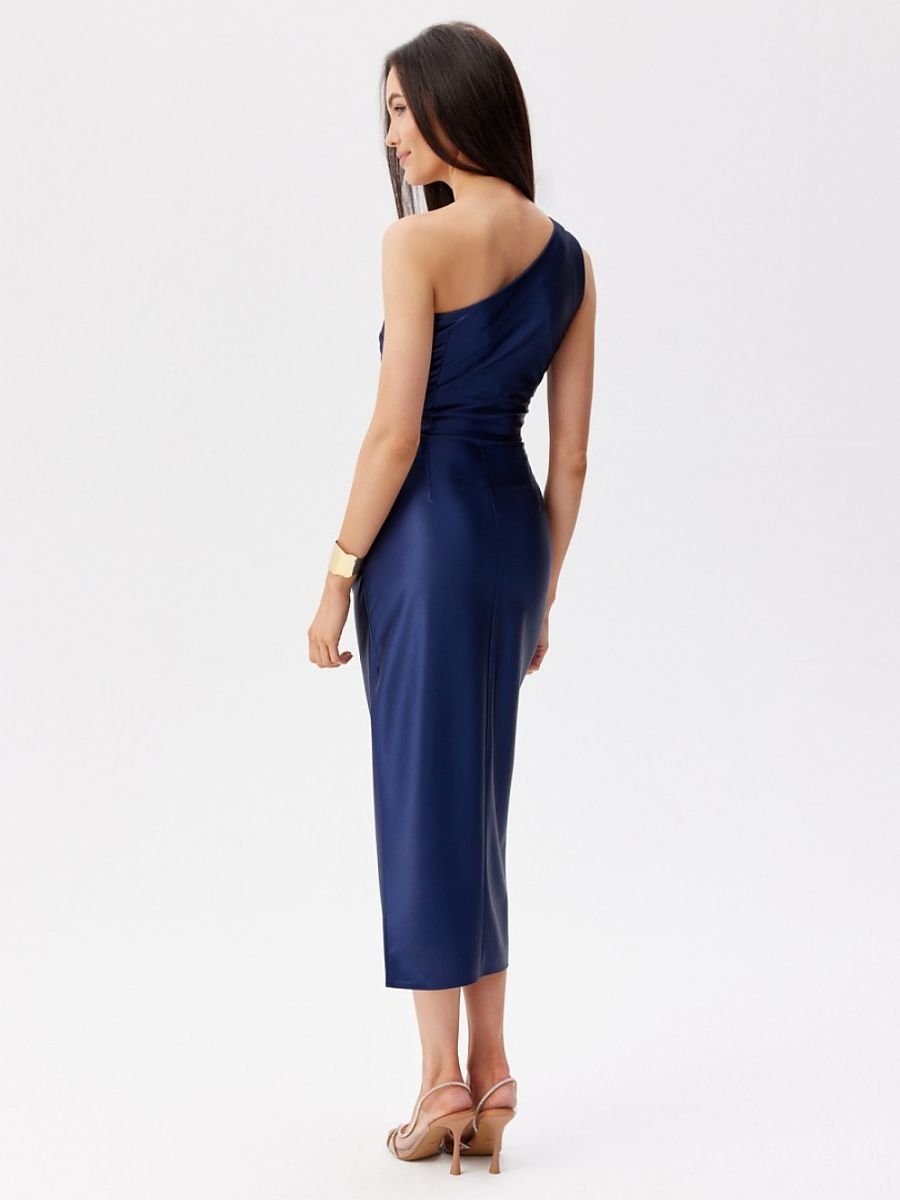 Abito midi in raso a una spalla. La parte superiore è asimmetrica con arricciature sulla spalla, mentre il fondo è dritto con uno spacco sulla gamba. Non ha fodera ed è chiusa con una cerniera lampo.