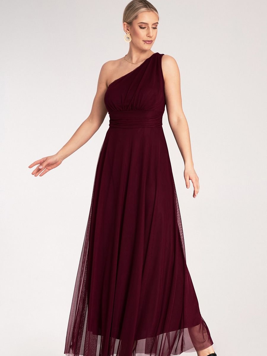 Un elegante abito lungo realizzato in un leggero e fluido materiale. Taglio asimmetrico con una larga spallina e arricciature in vita.