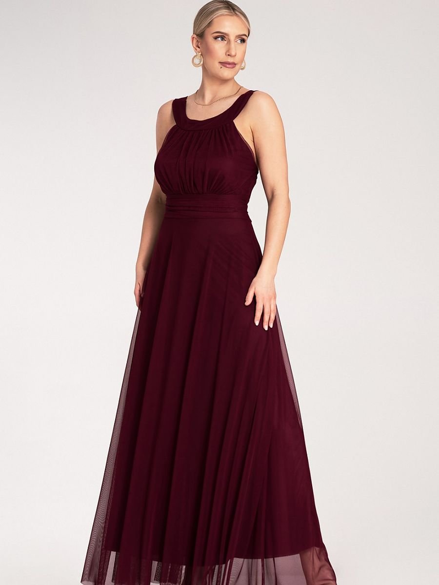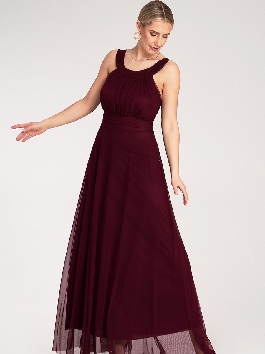 Un elegante abito lungo, realizzato in un leggero e fluttuante materiale. La parte superiore leggermente arricciata con spalline larghe e scollo alto. Modello con una vita attillata e arricciata.