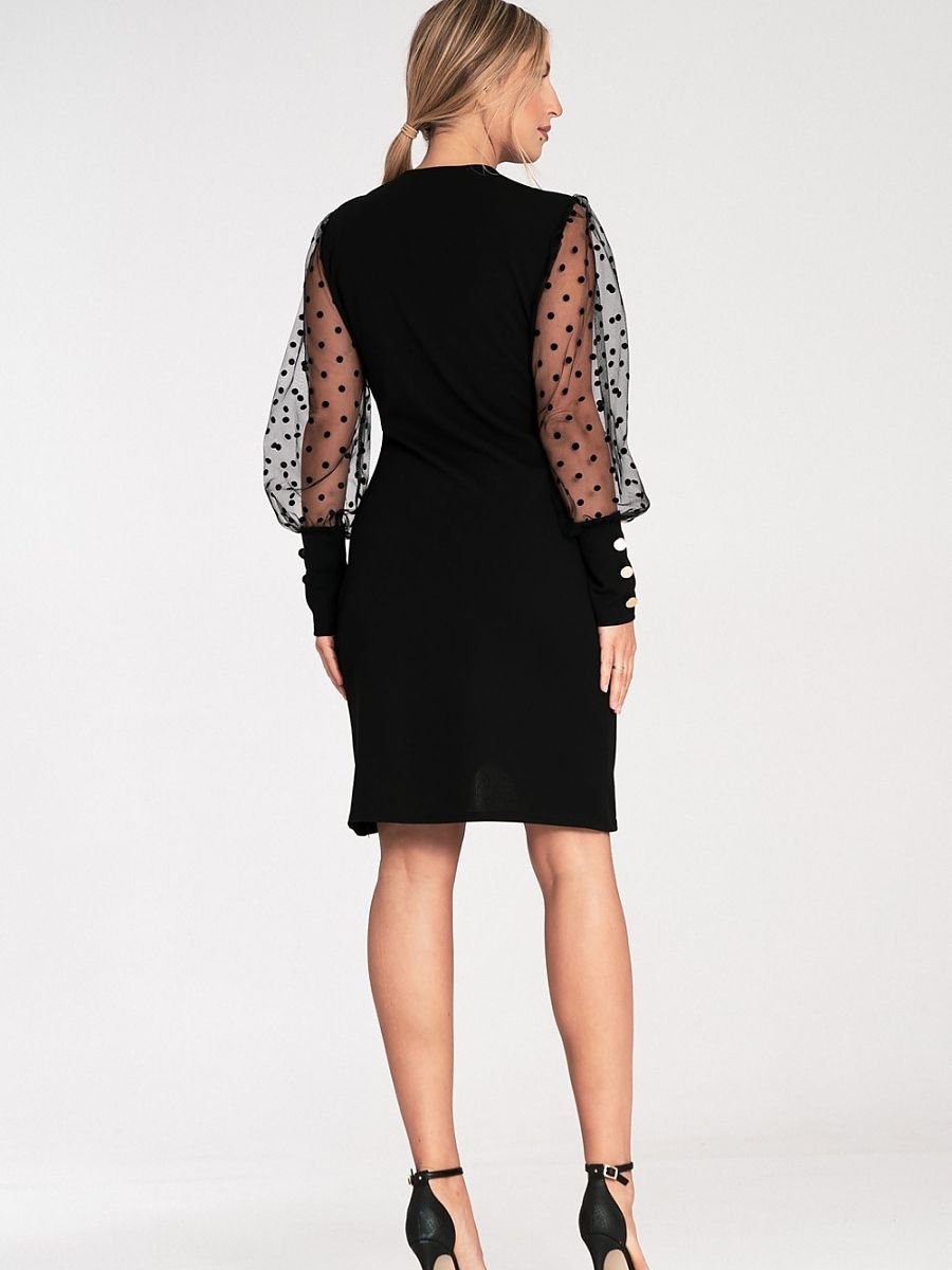 Abito con maniche a pois. Davanti e sui polsini bottoni dorati decorativi.