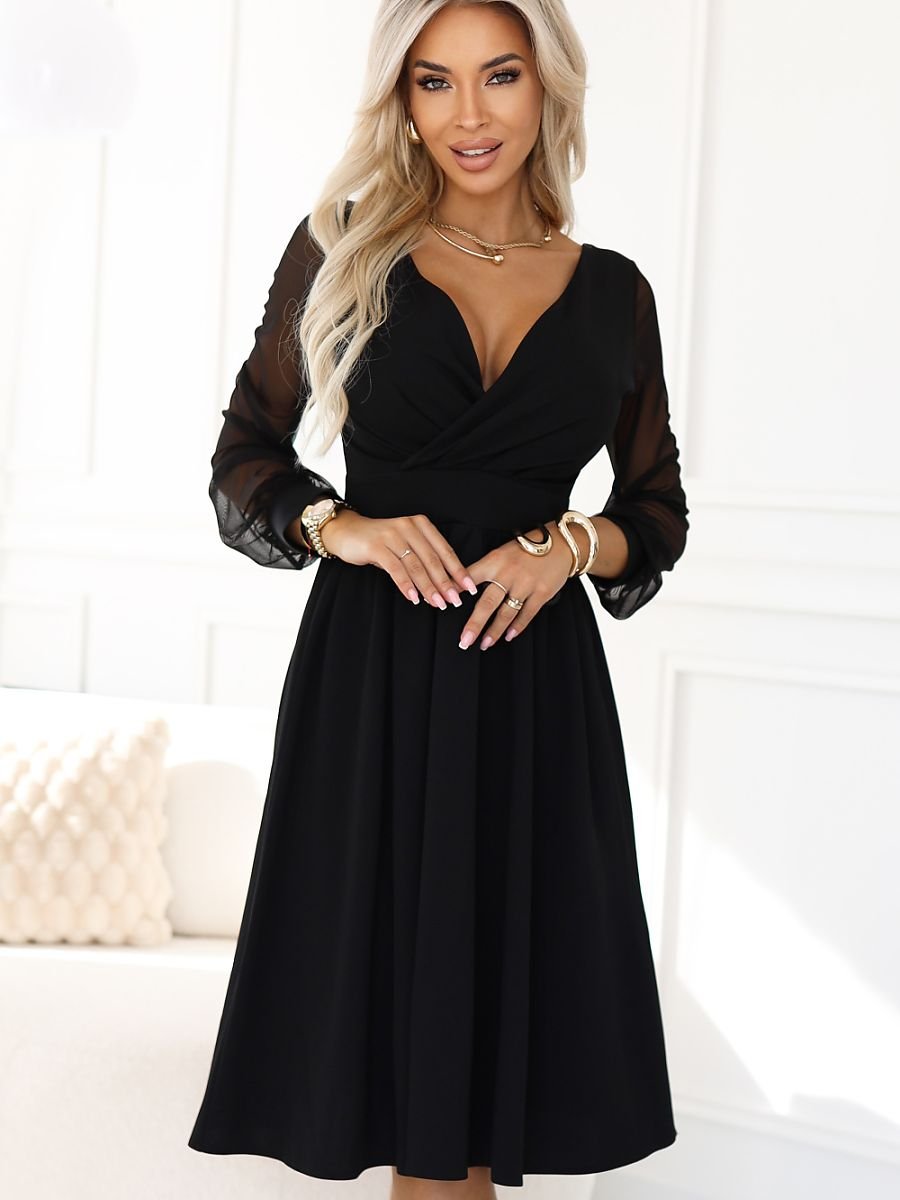 Questo elegante abito nero midi della marca Numoco è stato creato pensando alle donne che apprezzano uno stile senza tempo e un perfetto fitting. Il collo a scialle mette in risalto delicatamente la linea del seno, mentre il fondo leggermente svasato aggiunge leggerezza ed eleganza naturale alla silhouette. Le maniche trasparenti in tulle conferiscono all’intero abito un carattere raffinato, bilanciando delicatamente tra classicità e modernità. L’abito si adatta perfettamente a matrimoni, comunioni, battesimi, cene, appuntamenti, occasioni familiari, Capodanno o incontri di lavoro. È la scelta ideale se vuoi apparire elegante, femminile e allo stesso tempo sentirti comoda per tutto il giorno. Aggiungilo al carrello e crea un outfit in cui ti sentirai più sicura di te. Prodotto in Polonia.