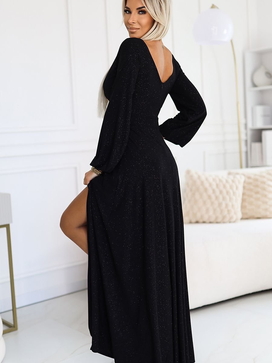 Il vestito NELA del marchio Numoco è un’elegante creazione lunga con uno spacco sulla gamba e maniche lunghe e larghe. Il vestito ha una scollatura a V sul davanti e una scollatura sensuale sulla schiena. Realizzato in un materiale elastico nero lucido che enfatizza perfettamente la silhouette. Prodotto polacco, perfetto per occasioni speciali.