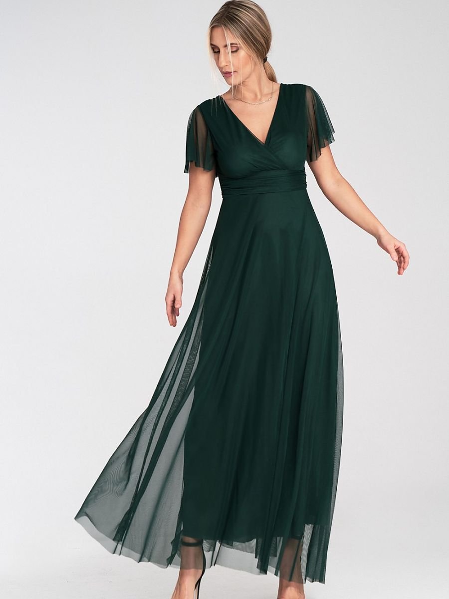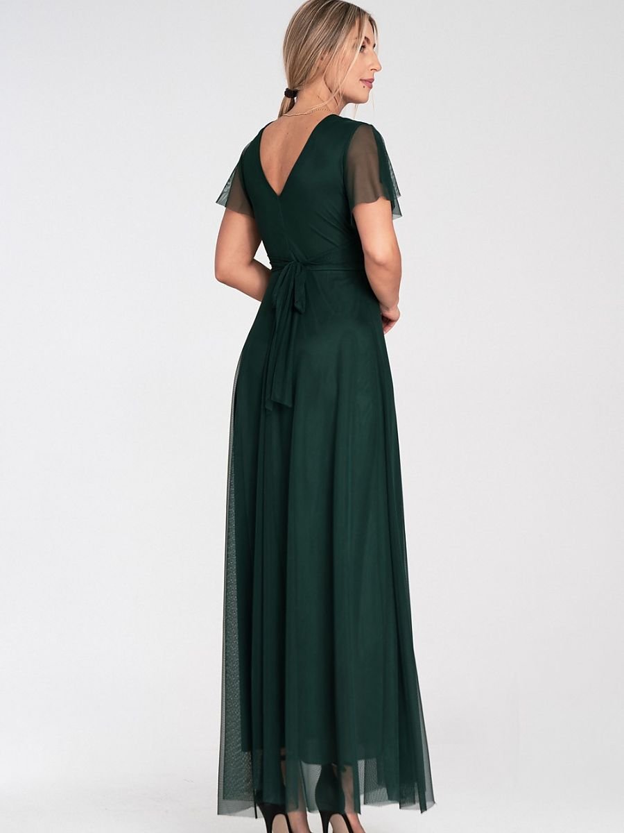 Abito midi in rete con maniche corte a farfalla. Modello con coppe cucite e scollo a cuore. Gonna svasata con fodera. Taglio largo sotto il seno che sottolinea la vita. Chiusura con zip sul retro.