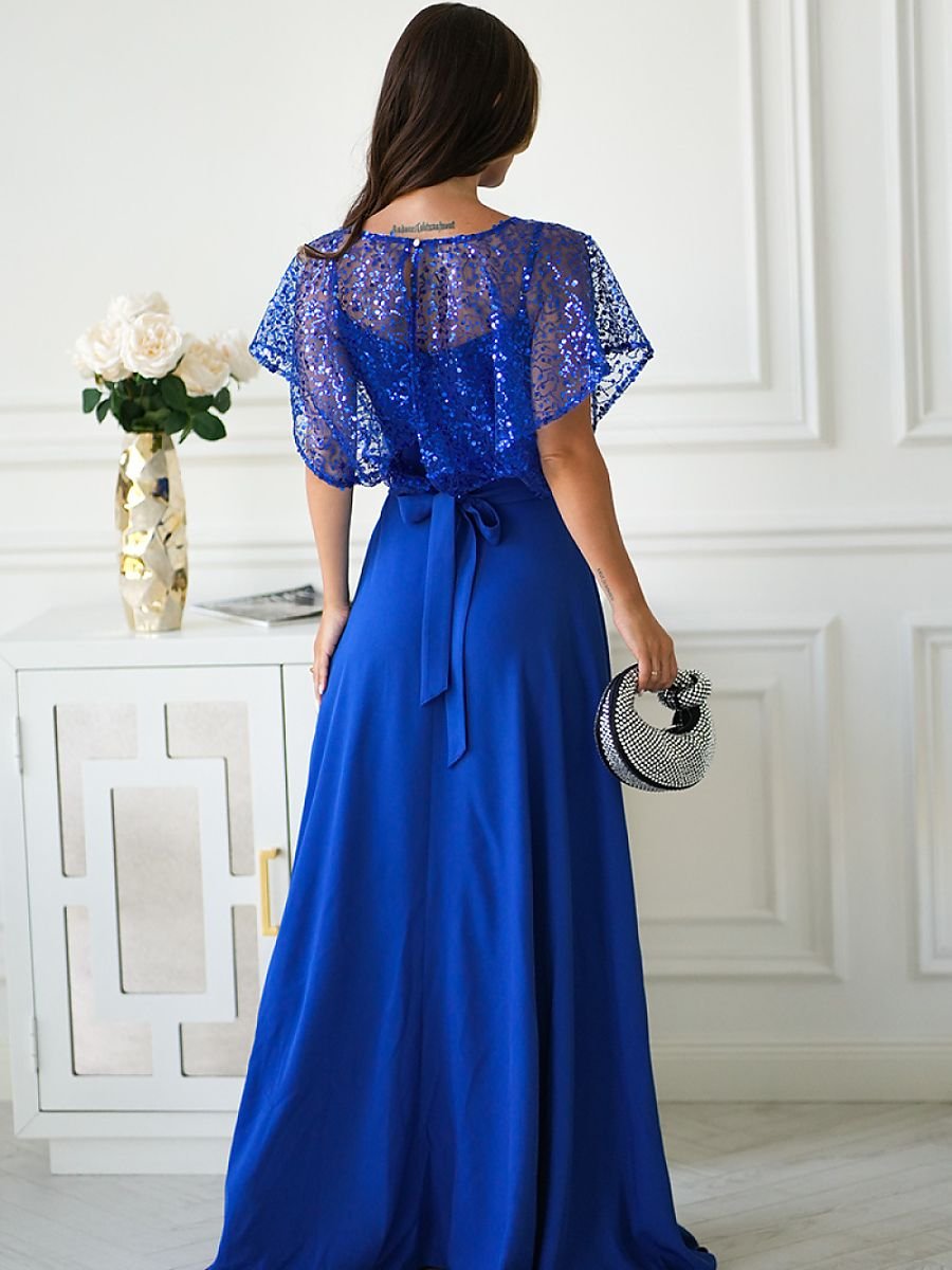 Elegante abito con spalline sottili, realizzato in un materiale leggero, completato da una giacca bolero scintillante con paillettes e una rosa sulla cintura. La finitura lucida aggiunge stile e luminosità alla creazione, rendendola la scelta ideale per serate e occasioni speciali. L’abito si chiude con una zip nascosta, facilitando l’indossamento e la rimozione dell’abito.